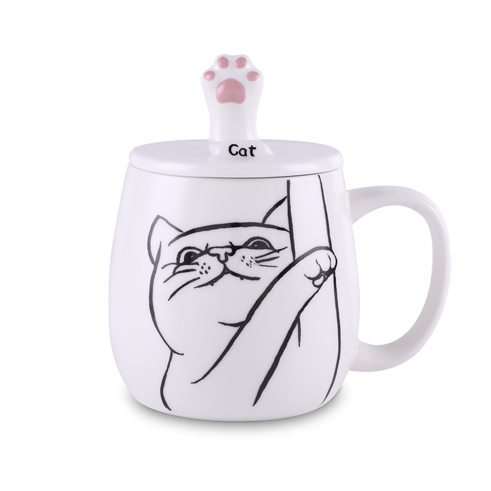 - CUTE DESIGN: The cat coffee mug has a unique lid. The whole mug looks like a kitten stretching out its claw to hold your mobile phone and free your hands.